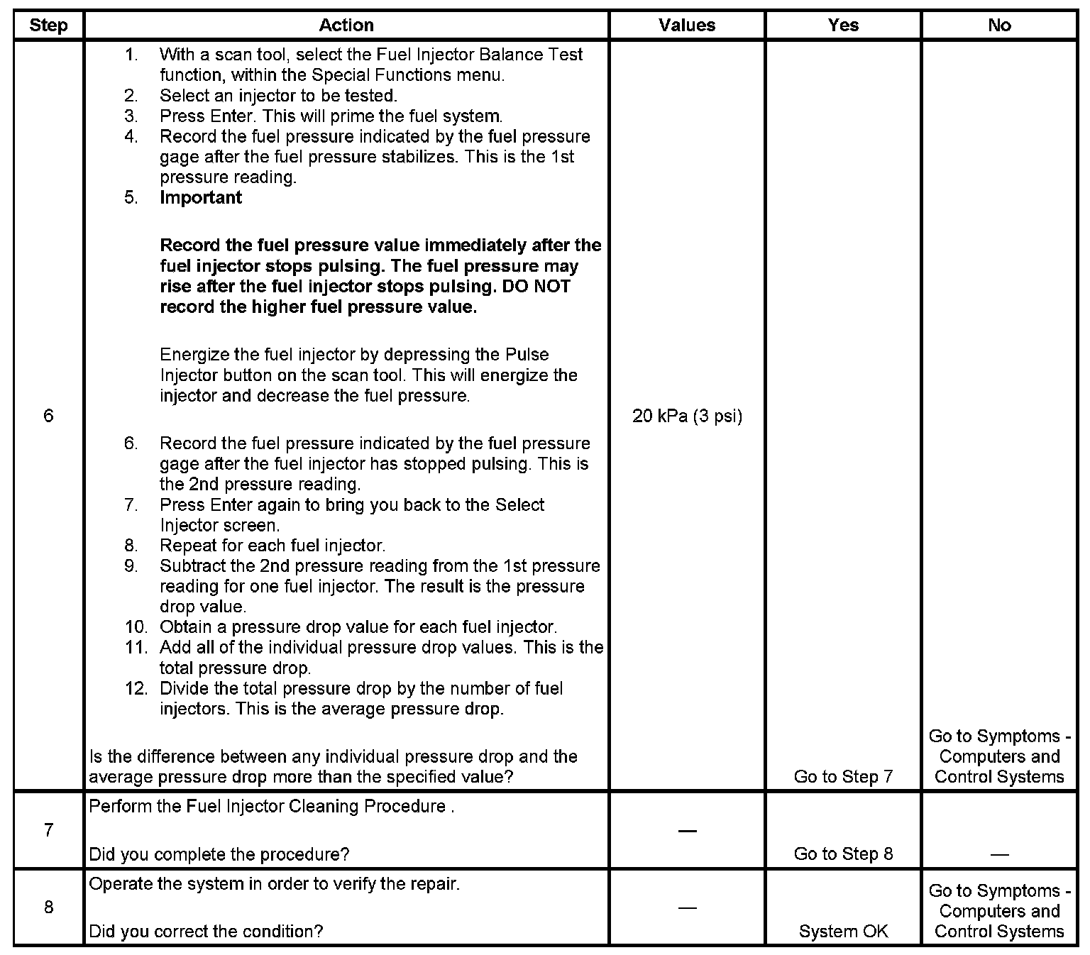 The scan tool is first used to energize the fuel pump relay. The scan tool is then used to pulse each injector for a precise amount of time allowing a measured amount of fuel into the manifold. This causes a drop in system fuel pressure that can be recorded and used to compare each injector.