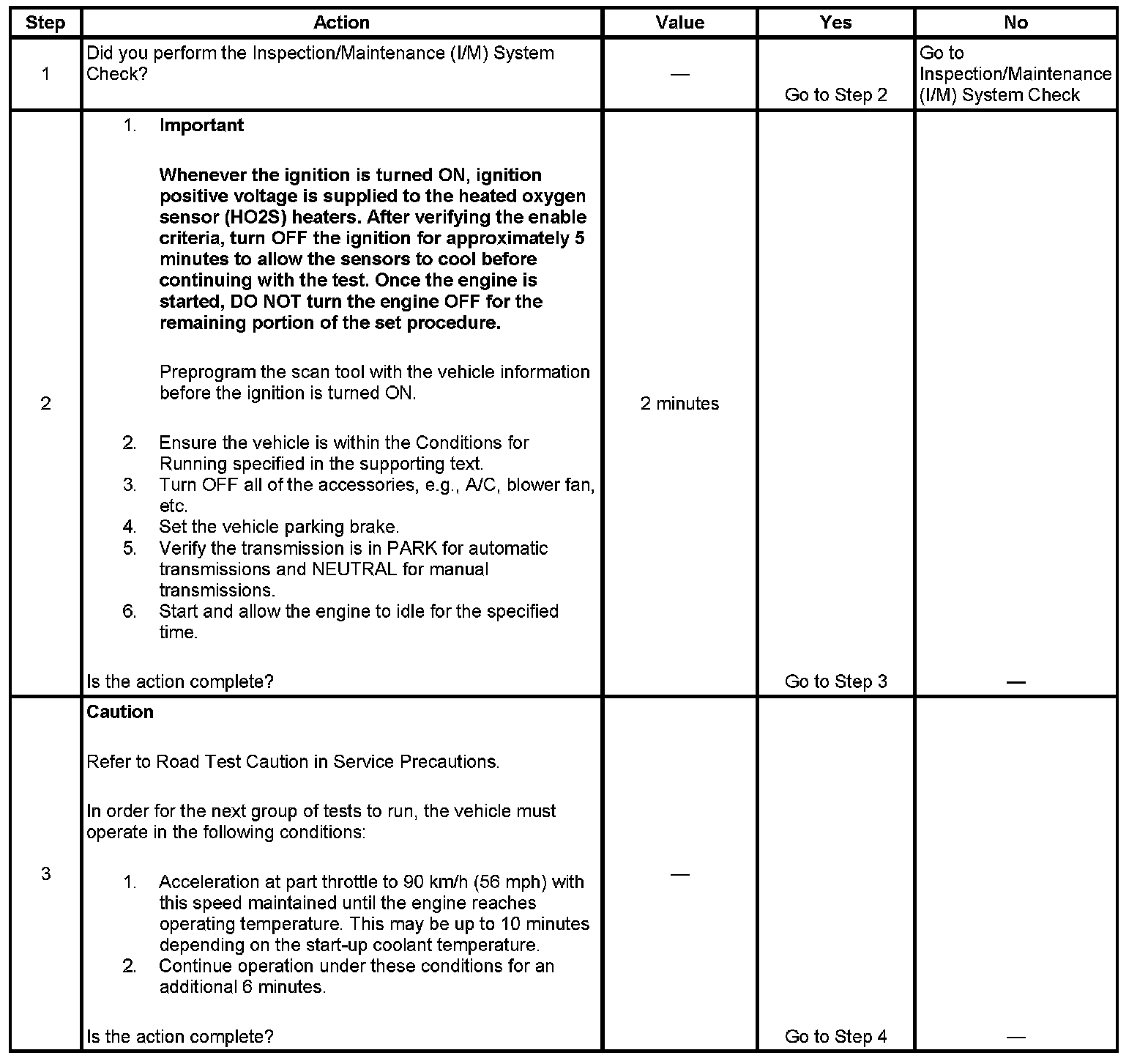 3. This step is to run the EVAP, AIR and the Oxygen Sensor Tests. The EVAP Test begins once the engine coolant reaches a calibrated temperature. The AIR Test, if equipped, begins shortly after Closed Loop and the indicated speed is achieved. The Oxygen Sensor Tests begin once the engine is at operating temperature, in Closed Loop fuel control, and a calibrated amount of time has elapsed.