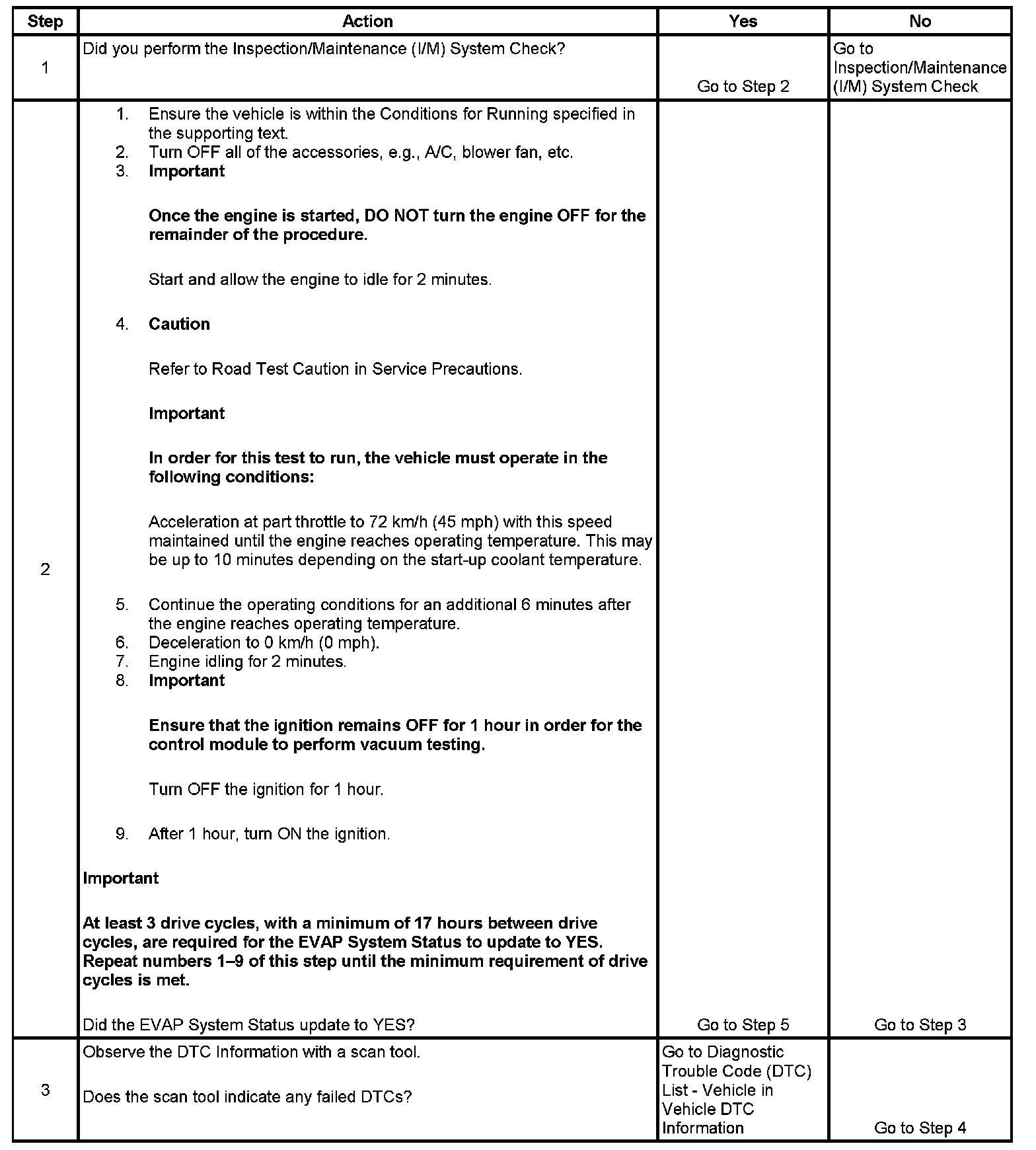 If there is an impending failure, the system may require more time to run than was allotted in the procedure. If any DTCs do not run after numerous attempts and no DTC is set, review the scan tool data list and conditions for running. This will give an indication of why the DTCs do not complete. If the EVAP I/M System Status does not update to YES, the procedure can be repeated until a YES status is achieved.
