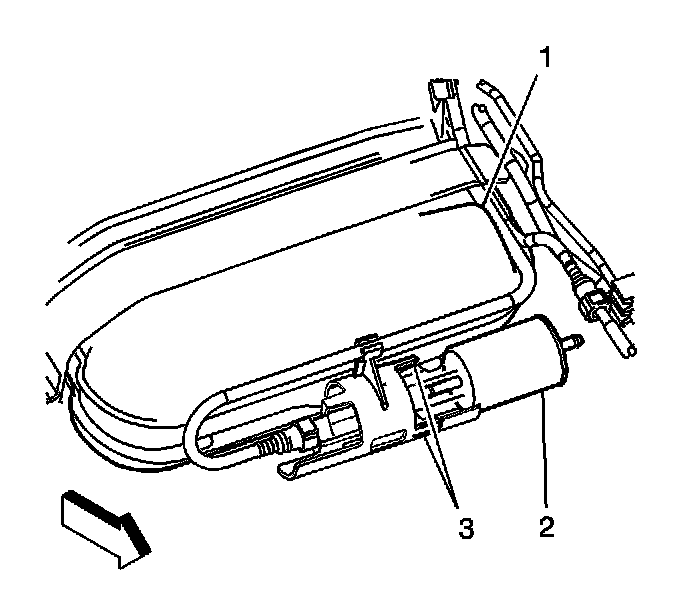 1. Slide the fuel filter (2) into the fuel filter bracket, until the locking tabs (3) are fully engaged.