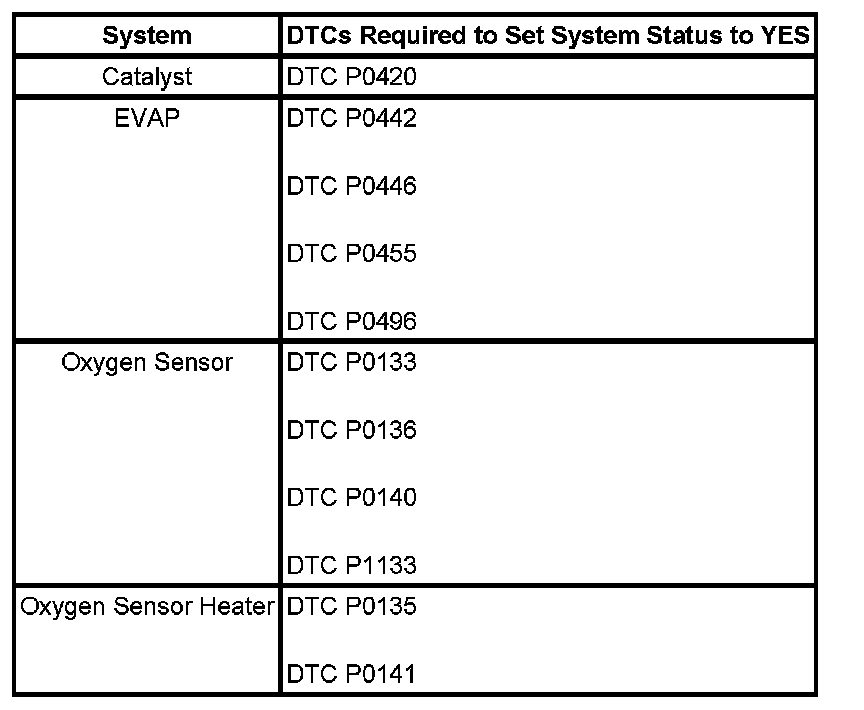 Inspection/Maintenance (I/M) System DTC Table: