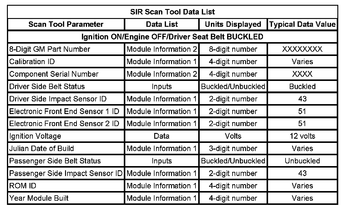 Use the SIR Scan Tool Data List as directed by a diagnostic table or to supplement the diagnostic procedures. Begin all of the diagnostic procedures with the Diagnostic System Check - Vehicle. Refer to the Diagnostic System Check - Vehicle. Use the SIR Scan Tool Data List after determining the following: