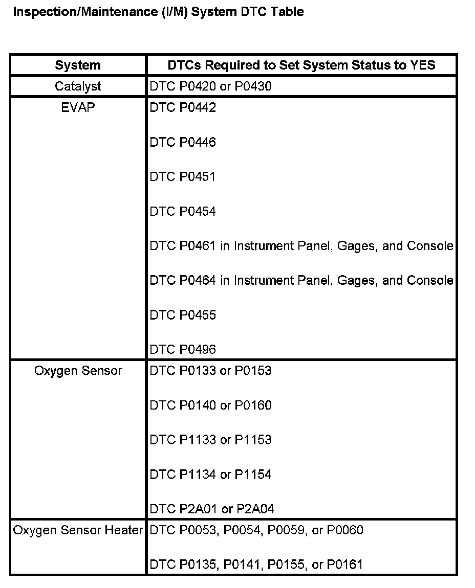 Inspection/Maintenance (I/M) System DTC Table: