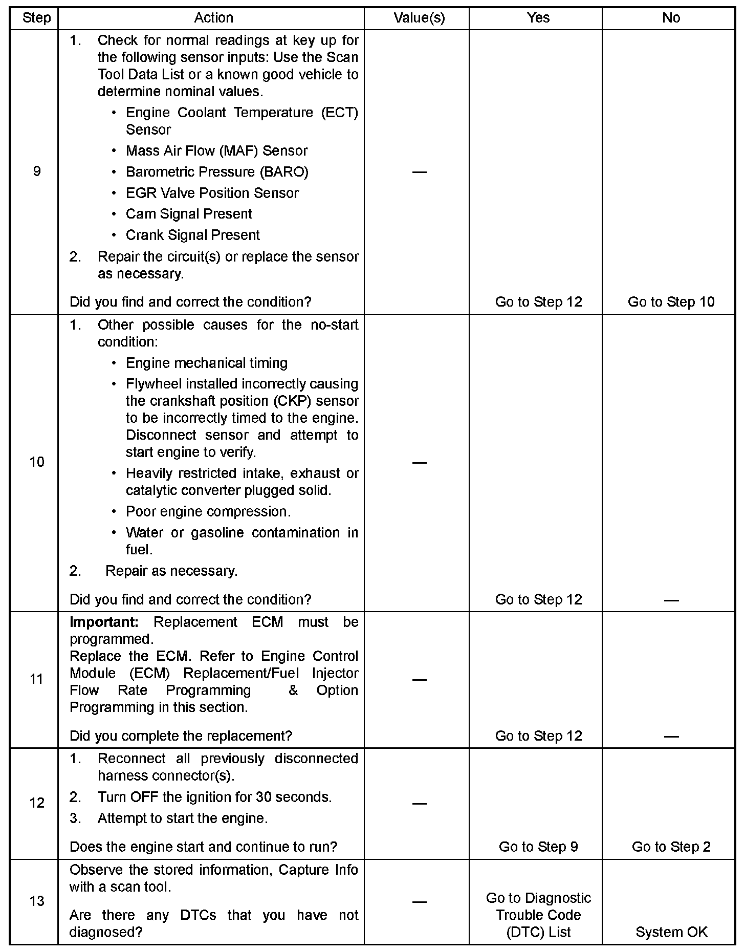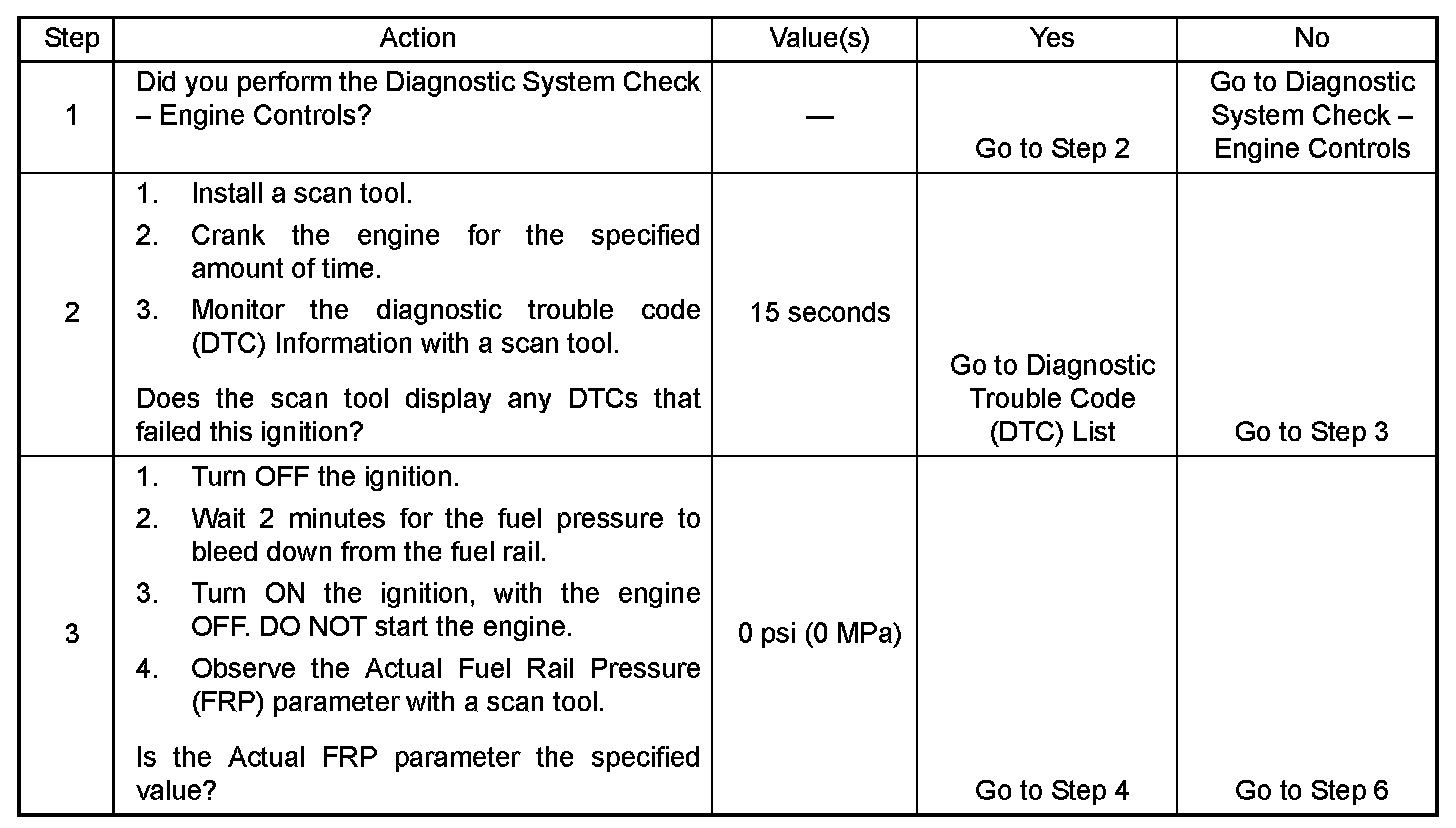 The Engine Cranks but Does Not Run diagnostic table is an organized approach to identifying a condition that causes an engine to not start. The diagnostic table directs the service technician to the appropriate system diagnosis. The diagnostic table assumes the following conditions are met: