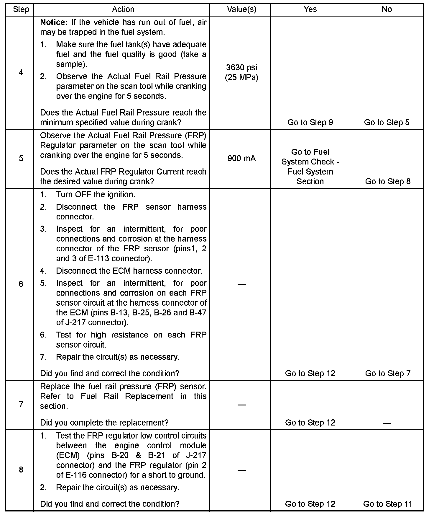 5. If the fuel rail pressure (FRP) regulator low control circuits between the ECM and the FRP regulator are shorted to ground, "Actual FRP Regulator" will be approximately 500 mA lower as compared with "Desired FRP Regulator".
