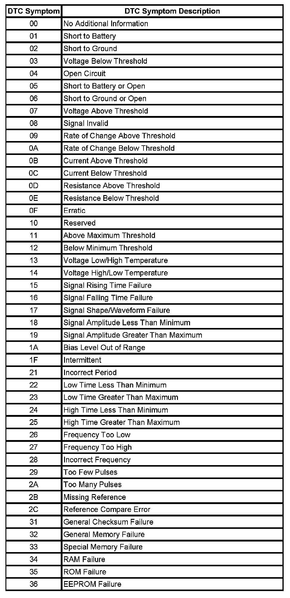 The DTC symptom is made up of 2 alphanumeric digits. The first digit following the DTC indicates the DTC symptom category. There are 16 possible categories available in the range of 0 through the letter F. Currently there are 8 categories in use, 0 through 7. These 8 categories together with their definitions are given.