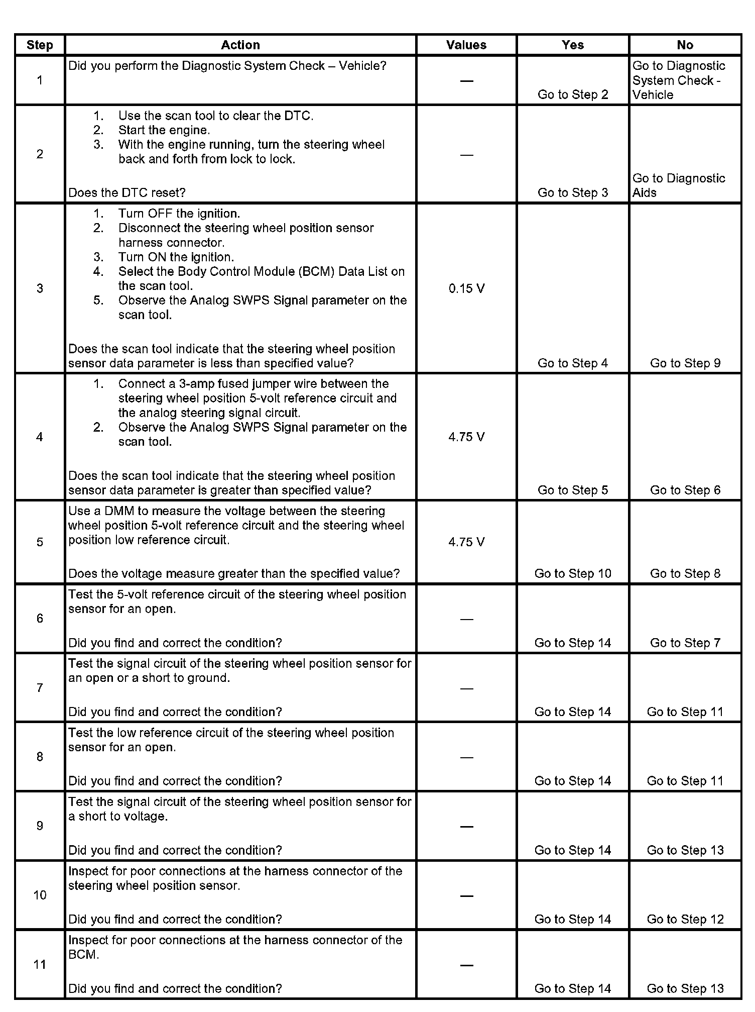 The steering wheel position sensor is a 0-5 volt device which is used to sense steering wheel position and turning speed. The valid signal voltage range of the sensor is 0.35-4.75 volts. The signal voltage will increase or decrease within the valid voltage range as the steering wheel is turned. The body control module (BCM) monitors the steering wheel position sensor signal voltage and transmits this data on the serial data line.