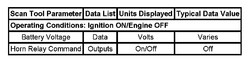 The Horns Scan Tool Data List contains all of the horn related parameters that are available on the scan tool. The parameters in the list are arranged in alphabetical order. The column, "Data List," indicates the location of the parameter within the scan tool menu selections. Use the Horns Scan Tool Data List as directed by a diagnostic table or in order to supplement the diagnostic procedures. Begin all of the diagnostic procedures with Diagnostic System Check - Vehicle. Initial Inspection and Diagnostic Overview