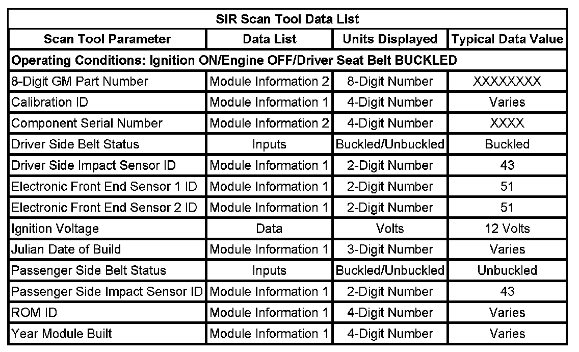 Use the SIR Scan Tool Data List as directed by a diagnostic table or to supplement the diagnostic procedures. Begin all of the diagnostic procedures with the Diagnostic System Check - Vehicle. Initial Inspection and Diagnostic Overview Refer to the Diagnostic System Check - Vehicle. Use the SIR Scan Tool Data List after determining the following: