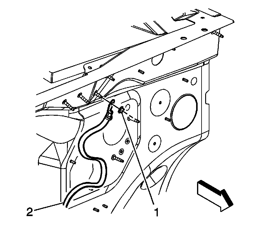 1. Install the ground strap (2) to the vehicle and the stud on the plenum front panel.