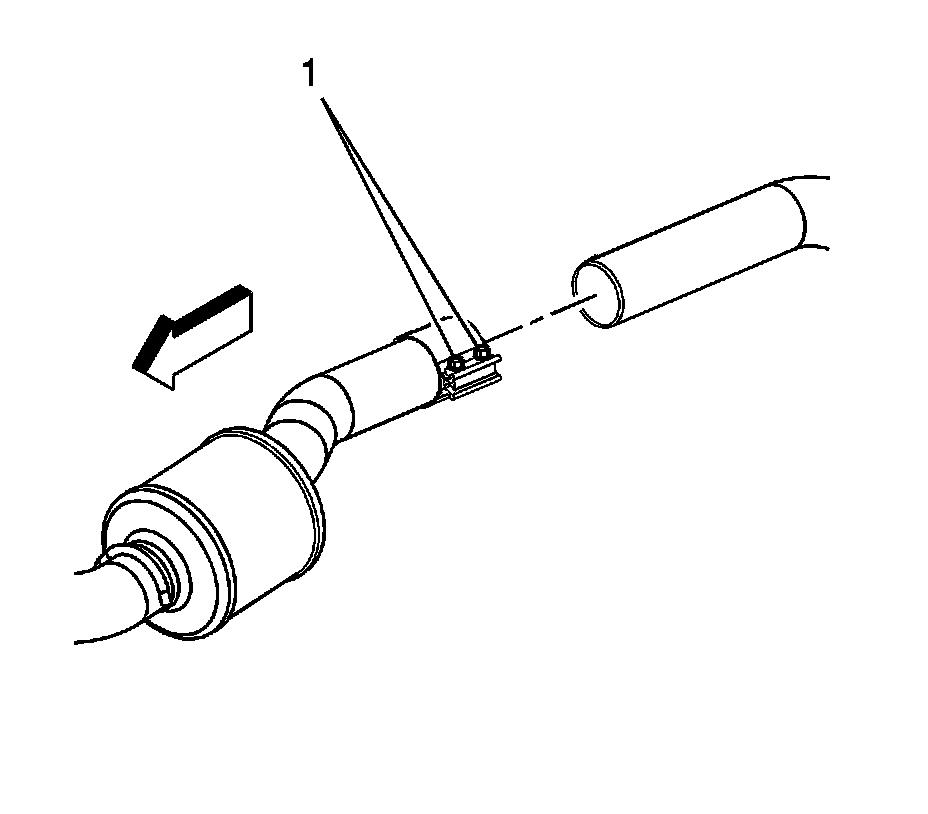 5. Install the catalytic converter until the muffler locator button is fully engaged by the coupling clip (1).