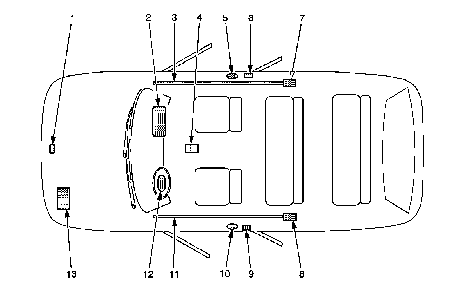 The SIR Identification Views shown below illustrate the approximate location of all SIR components available for the vehicle. This will assist in determining the appropriate SIR Disabling and Enabling for a given service procedure. Refer to SIR Disabling and Enabling.