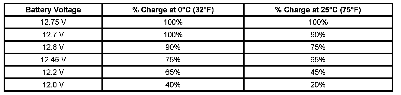 Important: The table is accurate to 10 percent only after the battery has been at rest for 12 hours.