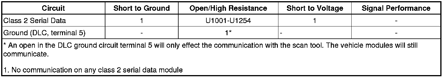 Modules connected to the class 2 serial data circuit monitor for serial data communications during normal vehicle operation. Operating information and commands are exchanged among the modules. Connecting a scan tool to the data link connector (DLC) allows communication with the modules for diagnostic purposes. DTCs may be set due to this symptom and during this diagnostic procedure.