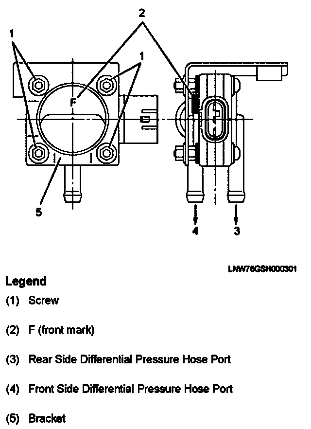 1. Install the bolts (1) to the bracket of the exhaust differential pressure sensor.