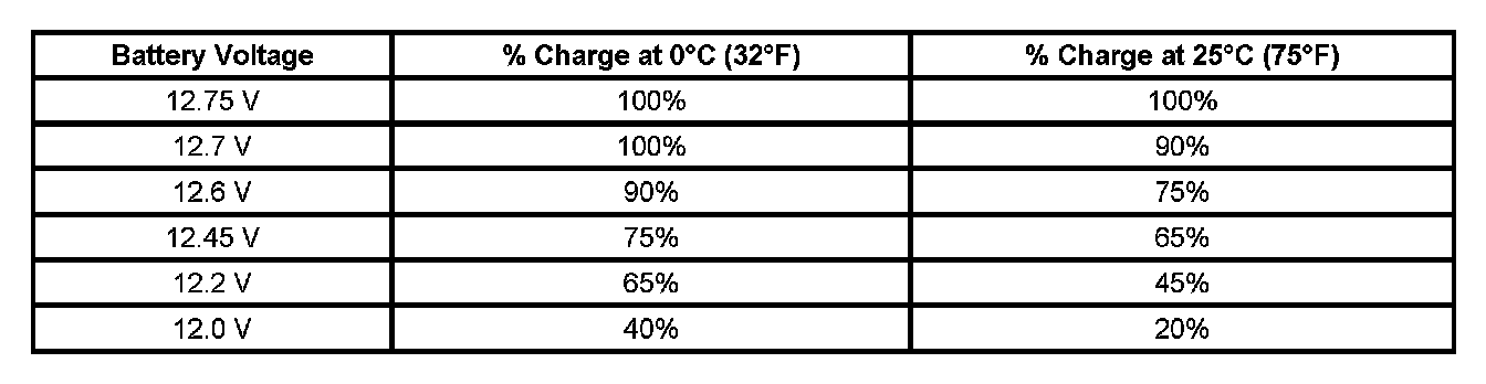Important: Using voltage to determine the 12V batteries state of charge (SOC) is only accurate after the battery has been at rest for 24 hours. This is enough time for the acid in each cell to equalize. If the battery has been charged or discharged in the past 24 hours, the battery SOC will only be an estimate.