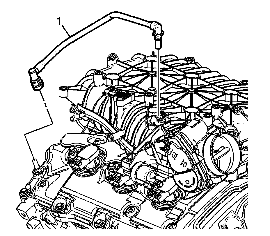 5. Disconnect and remove the positive crankcase ventilation (PCV) tube (1) from the intake manifold and right camshaft cover.