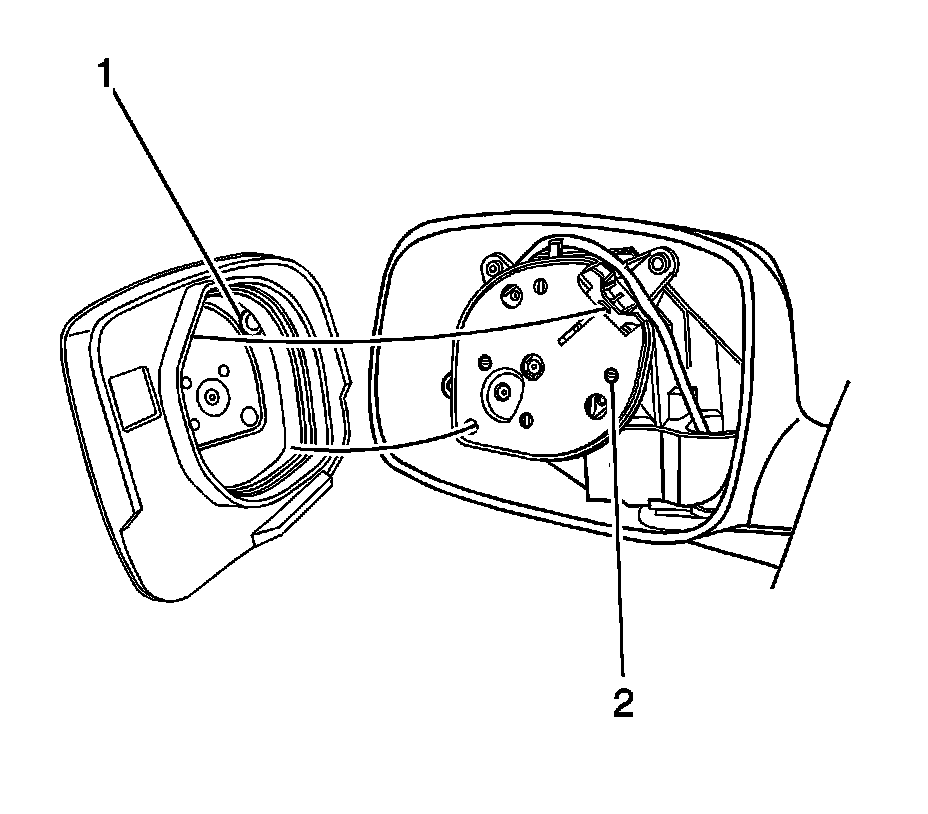 2. Remove the mirror glass (1) from the mirror motor (2) with sufficient force to disengage the snap-locks on the mirror motor.