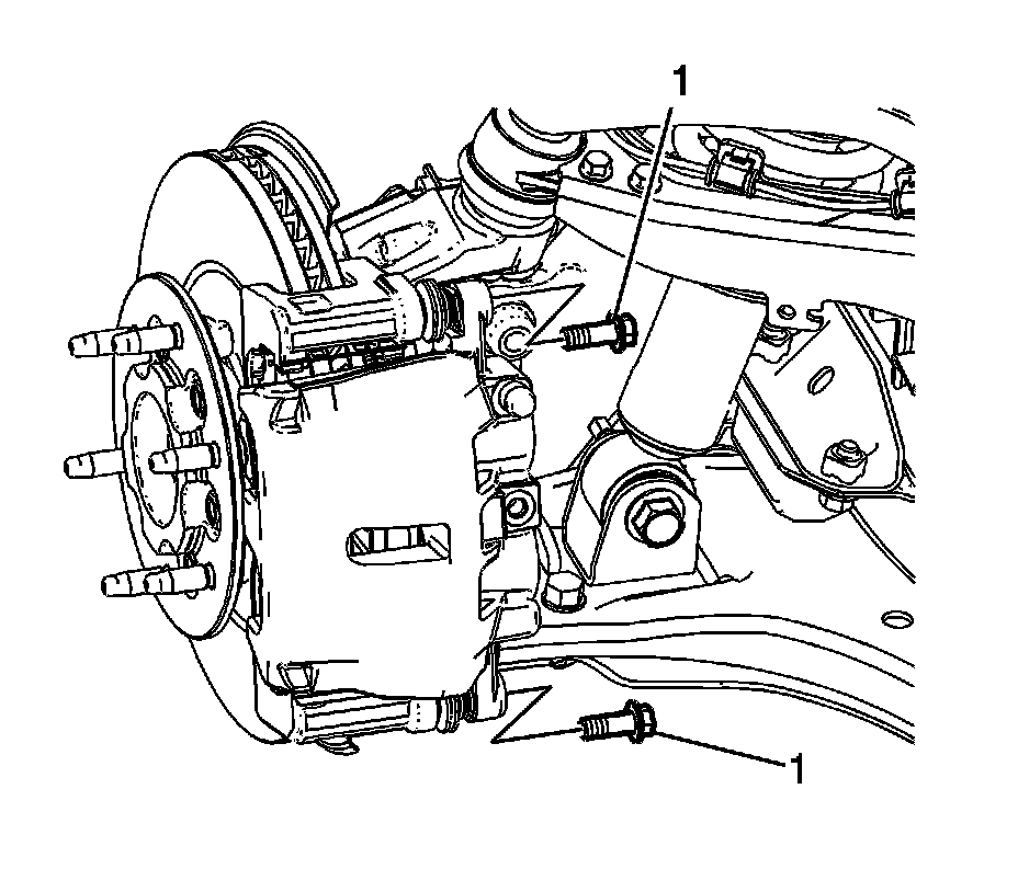 2. Install the brake caliper guide pin bolts (1) and tighten to 64Nm (47 lb ft).