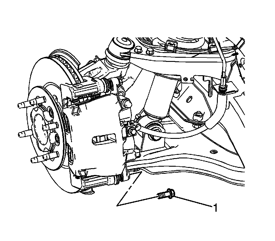 Caution: Support the brake caliper with heavy mechanic wire, or equivalent, whenever it is separated from its mount and the hydraulic flexible brake hose is still connected. Failure to support the caliper in this manner will cause the flexible brake hose to bear the weight of the caliper, which may cause damage to the brake hose and in turn may cause a brake fluid leak.