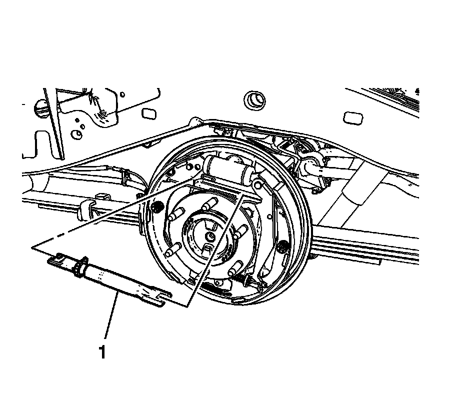 4. Carefully spread the top of the brake shoes away from the wheel cylinder and install the brake shoe adjuster assembly (1).