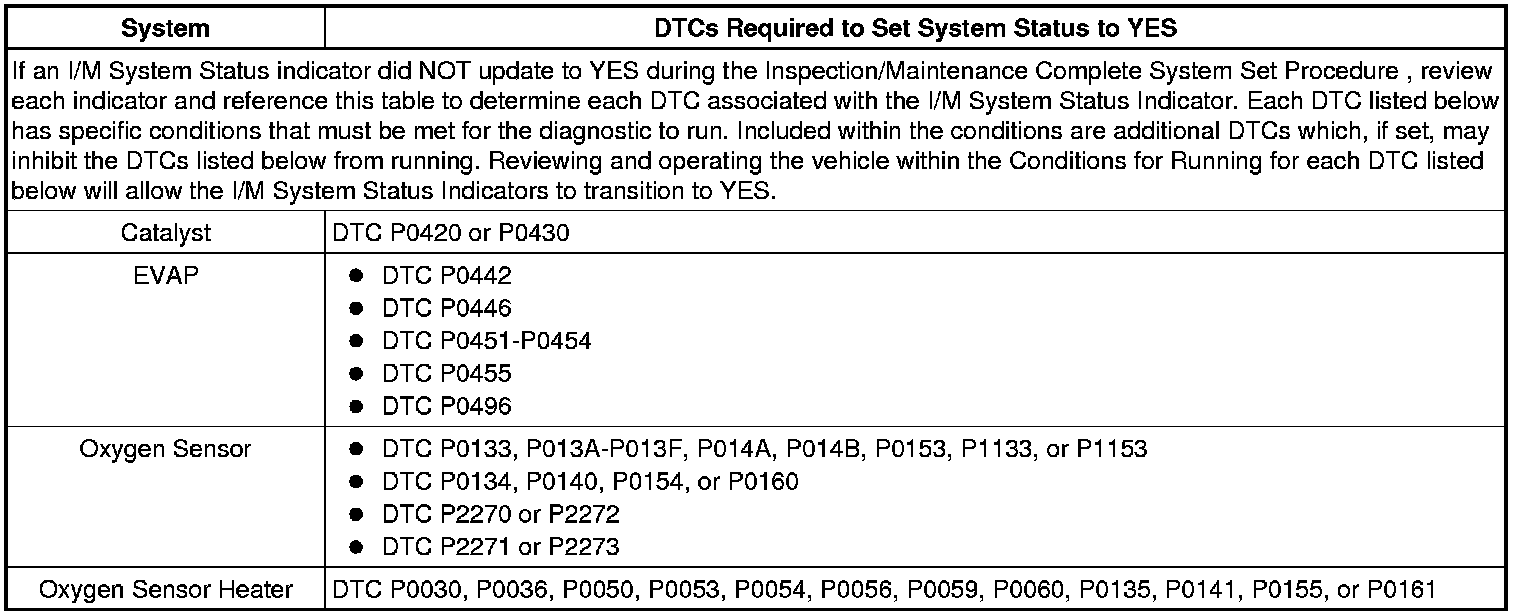 Inspection/Maintenance (I/M) Test DTC Table