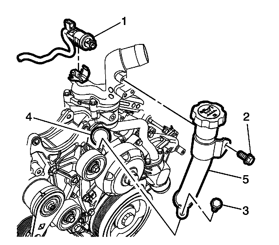 10. Remove the oil fill tube bolt (3); the oil fill tube retainer bracket bolt (2); the oil fill tube (5) and the seal (4).