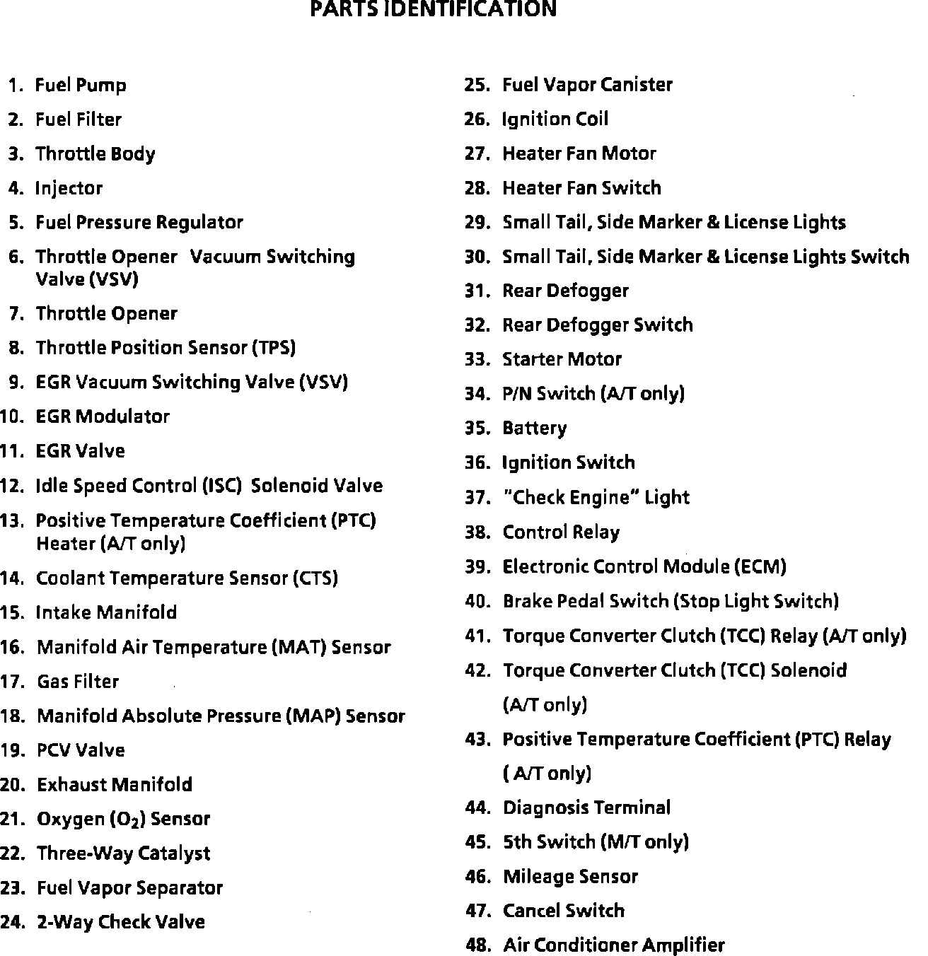 When a failure occurs, a signal indicating such failure is sent to the ECM, which judges that signal as such. However, control over the injector, ISC solenoid valve, and other components are maintained on the basis of the standard signals stored in the memory of the ECM, while ignoring that failure signal. This function is called "Fail-Safe Function." Thus, with this function, a certain level of engine performance is available even when some failures occur in these sensors or their circuits. This allows the vehicle to run even if a failure exist.
