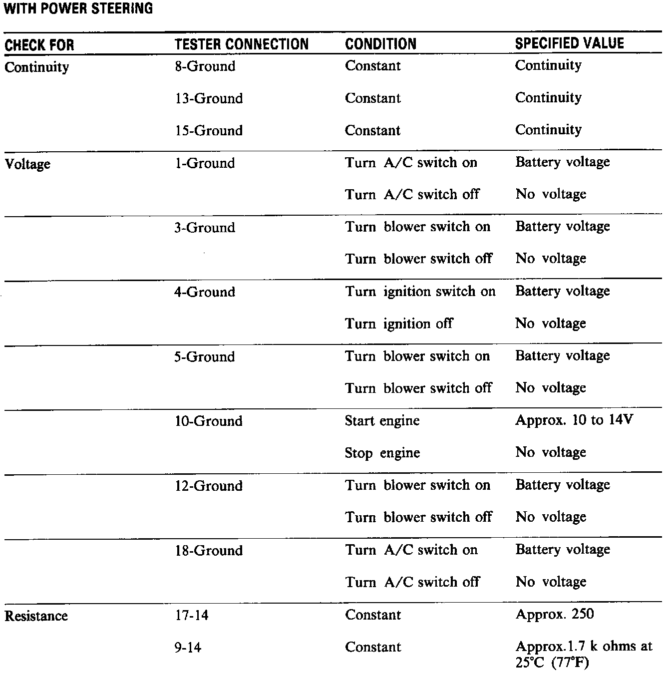 ^ Disconnect amplifier and inspect the connector on the wire-harness side as shown in the chart.