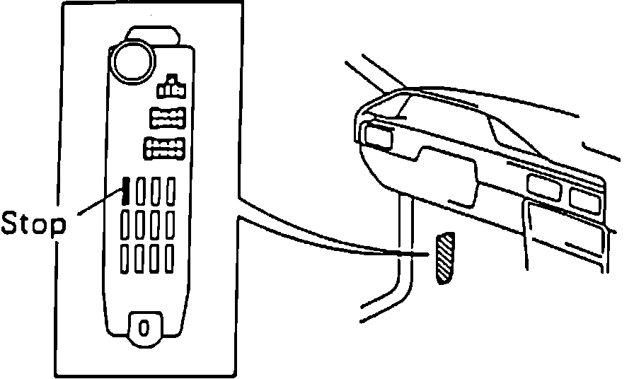 The check engine lamp will be illuminated when the ignition switch is in the On position with engine not operating. When engine is started, the Check Engine lamp should go off. If lamp remains on, a code has been stored by the Electronic Control Unit (ECU) memory. After diagnosis and repair, place ignition switch in Off position, then clear codes stored in the ECU memory by removing the Stop Fuse. The Stop fuse is located in a fuse panel, in the passenger compartment, on driver's side, behind kick panel, Fig. 4. The fuse must be removed for 10 seconds or longer, depending on ambient temperature. The lower the ambient temperature, the longer the fuse will have to be removed.