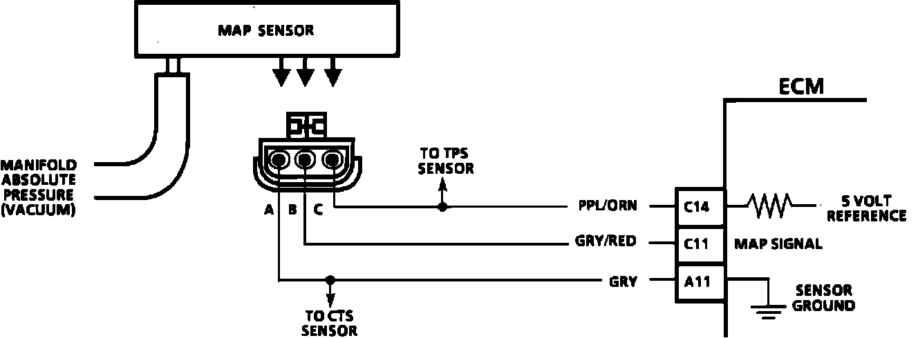 1. Checks MAP sensor output voltage to the ECM. With the ignition "ON" and the engine stopped, the manifold pressure is equal to atmospheric pressure and the signal voltage will be high. This voltage, without engine running, represents a barometer reading to the ECM. Comparison of this BARO reading with a known good vehicle with the same sensor is a good way to check accuracy of a suspect sensor. Readings should be the same +/- .4 volt.