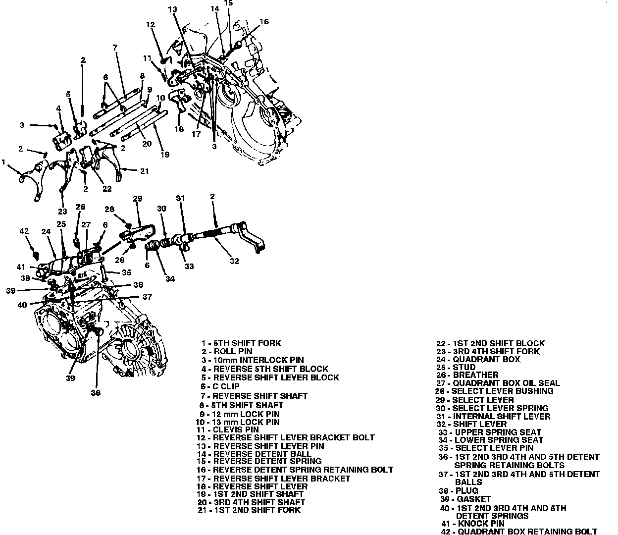 This transaxle also uses four interlock pins that are 10 mm long. Three are used in conjunction with the lock pins in the lower transaxle case. A fourth pin is located in the reverse/5th shift block. It prevents the transaxle from being shifted from fifth gear to reverse without going through neutral.