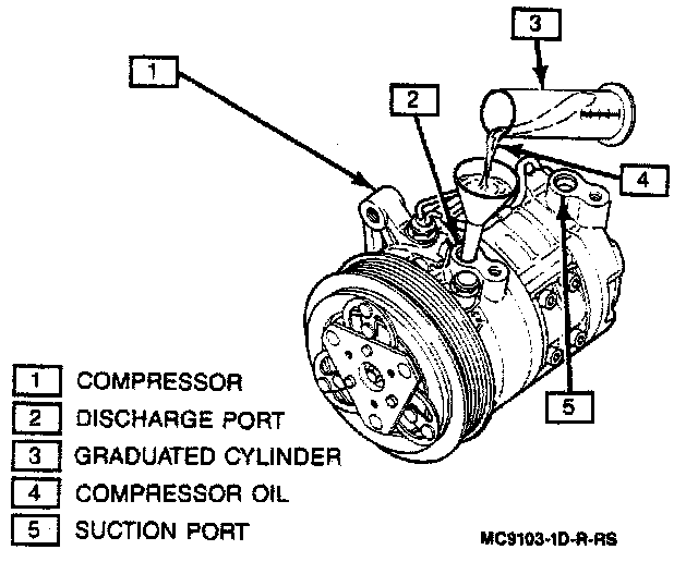 ^ If more than 70 ml (2.35 fl. oz.) of oil was removed from the compressor, then add that amount of new compressor oil (GM # 12345762) to the compressor through the discharge port.