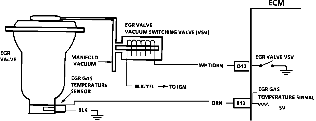 A properly operating EGR system will directly affect the air/fuel requirements of the engine. Since the exhaust gas introduced into the air/fuel mixture is an inert gas (contains very little or no oxygen), less fuel is required to maintain a correct air/fuel ratio. If the EGR system were to become inoperative, the inert exhaust gas would be replaced with air and the air/fuel mixture would be leaner. The ECM would compensate for the lean condition by adding fuel, resulting in higher block learn values. The engine control system operates within two block learn cells, a closed throttle cell and an open throttle cell. Since EGR is not sued at idle, the closed throttle cell would not be affected by EGR system operation. The open throttle cell is affected by EGR operation and when the EGR system is operating properly, the block learn values in both cells should be close to being the same. If the EGR system was inoperative, the block learn value in the open throttle cell would change (become higher to compensate for the resulting lean system, but the block learn value in the closed throttle cell would not change. This change or difference in block learn values is used to monitor EGR system performance.