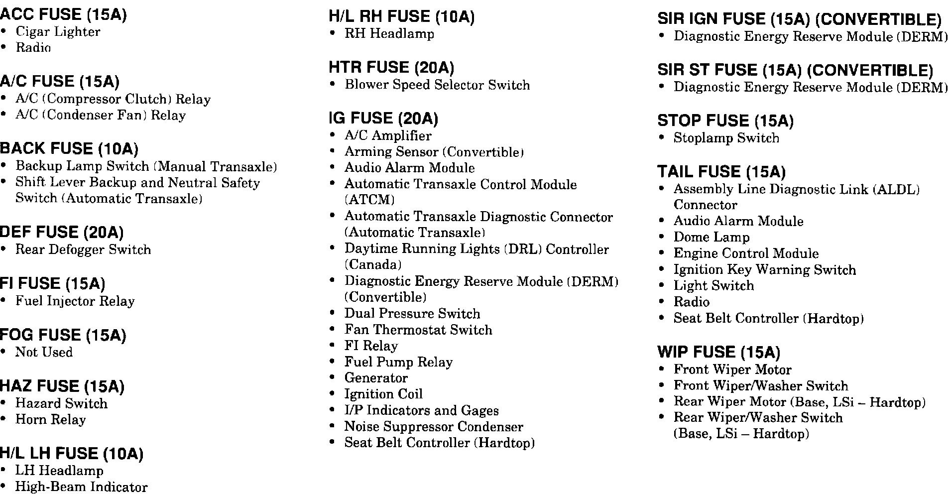 SIR Fuse Box Fuse Description