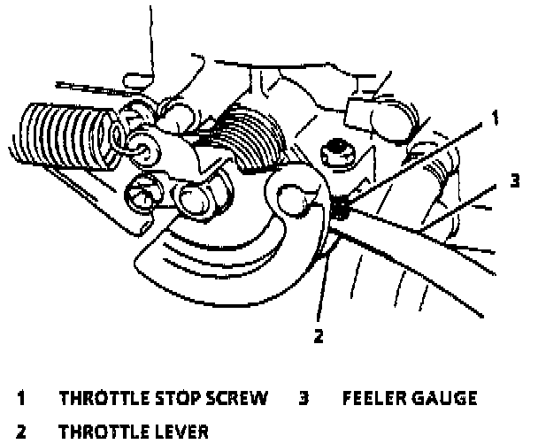 2. Insert 0.3 mm (0.12") feeler gage between throttle stop screw and throttle lever.