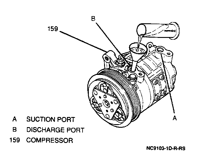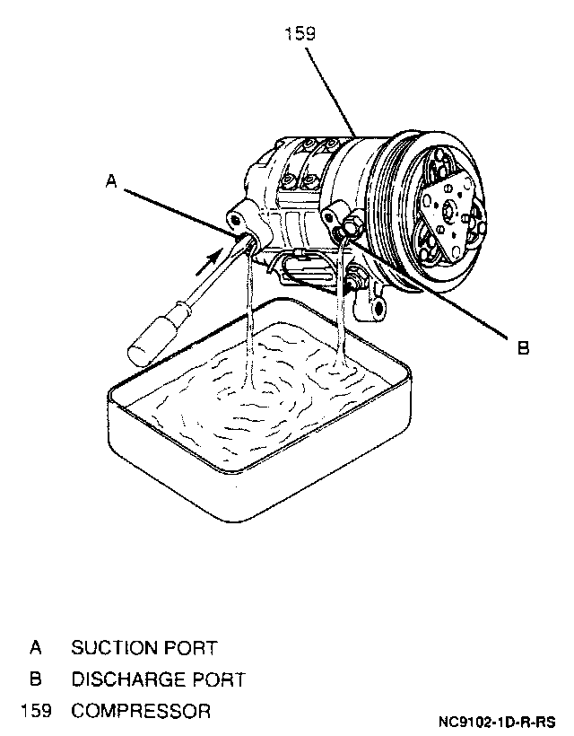 1. Drain the oil from the new compressor through the discharge and suction ports into a clean container. Insert a screwdriver into the suction port, depressing the check valve and allowing the oil to flow out. The oil will flow freely from the discharge port. Measure and record the amount of oil drained.