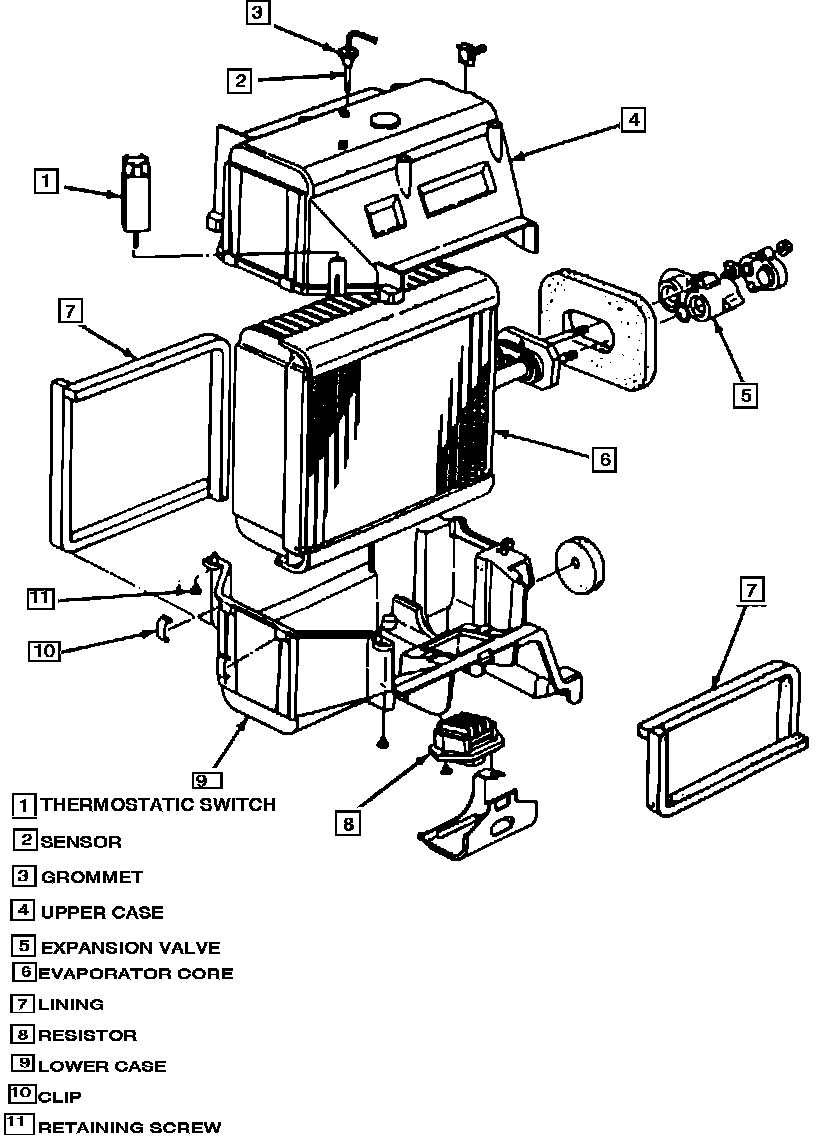 8. Remove evaporator assembly from dash, then retaining clip from evaporator case.