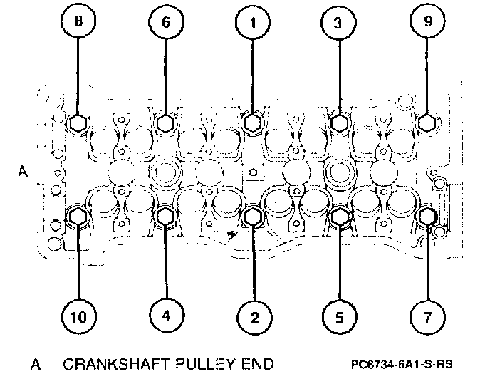 Cylinder head bolts must be tightened in several passes and in the sequence shown in the illustration. If the bolts are not tightened in this fashion, damage may occur to the cylinder head.