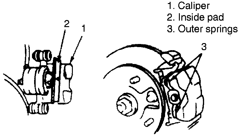 3. Remove caliper from knuckle, taking care not to drop inside pad. If only shoe and lining assemblies are to be replaced, suspend caliper from chassis using suitable hanger. Do not allow caliper to hang by brake hose.