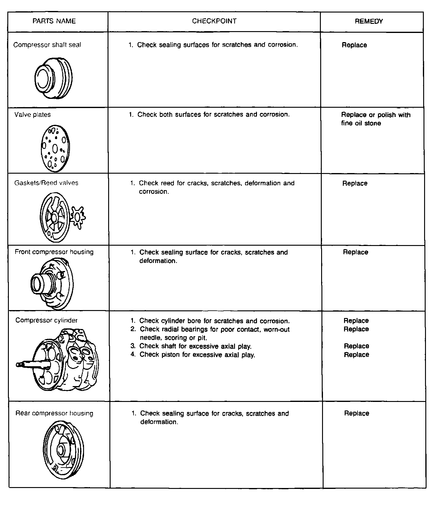 ^ All compressor parts that were removed. Refer to the "Component Checkpoint Chart".