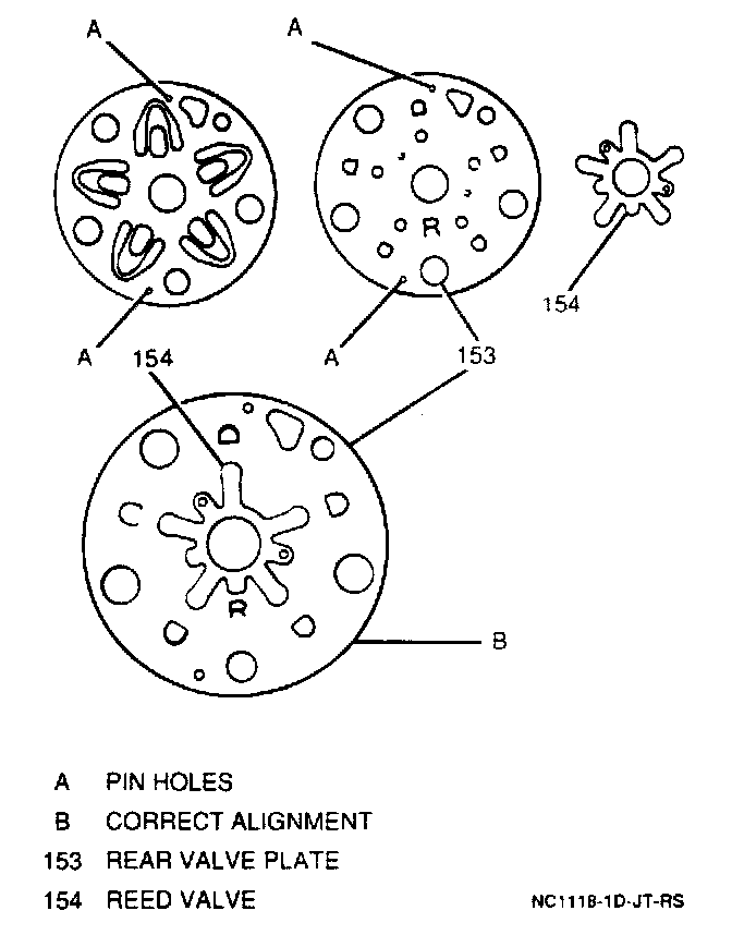3. Suction valve, valve plate and reed valve to rear of compressor, lining up the plates with the 2 pins.