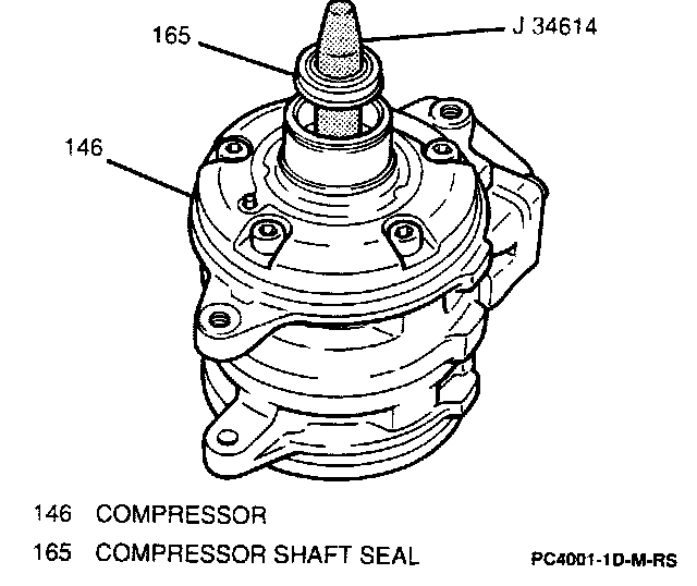 B. Apply PAG compressor oil to shaft seal O-ring and install compressor shaft seal onto J 34614 (when fitting the shaft seal onto the J 34614, he sure to have the 0-ring facing down).