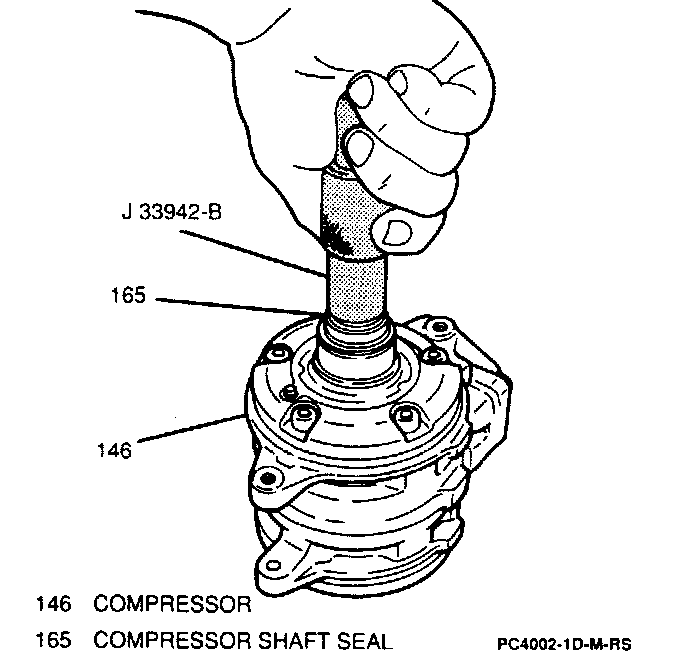 4. Compressor shaft seal using a J 33942-B. Insert tool, turn 45 degrees and pull shaft seal out.