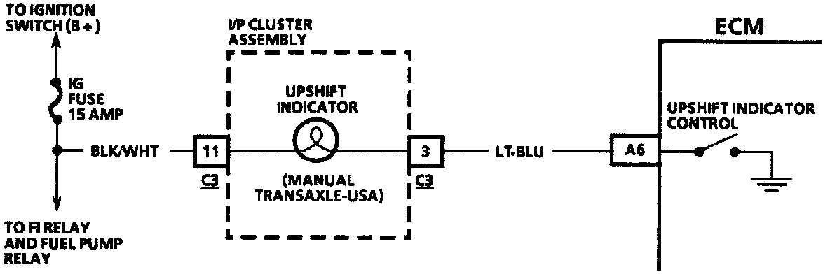 The upshift indicator indicates the best transaxle shift point for maximum fuel economy. The indicator is controlled by the Engine Control Module ECM and is turned "ON" by grounding the LT BLU wire from the I/P cluster assembly to the ECM. If the LT BLU wire is grounded the lamp will be "ON" all the time. If the circuit is open, the indicator will not light when commanded by the ECM.