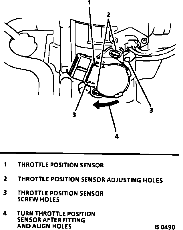 ^ Insert 0.3 mm (.012 in) feeler gage between throttle stop screw and throttle lever and with retaining screws loosely installed, turn TPS fully clockwise, then slowly counter clockwise just until ohmmeter indicates continuity. Tighten TPS retaining screws to 2 Nm (18 in.lbs.).