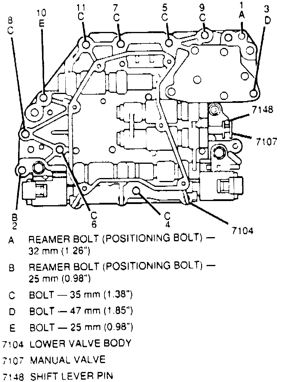 CAUTION: Torque sequence and specification is very important to valve body operation. If bolts are tightened at random, valve bores may become distorted and inhibit valve operation. Make sure all parts are clean and free of damage prior to their installation. When installing valve body to case, make sure accumulators and springs are in their correct positions and all valve body bolts are installed according to length and position. Do not use air powered tools when installing valve body.