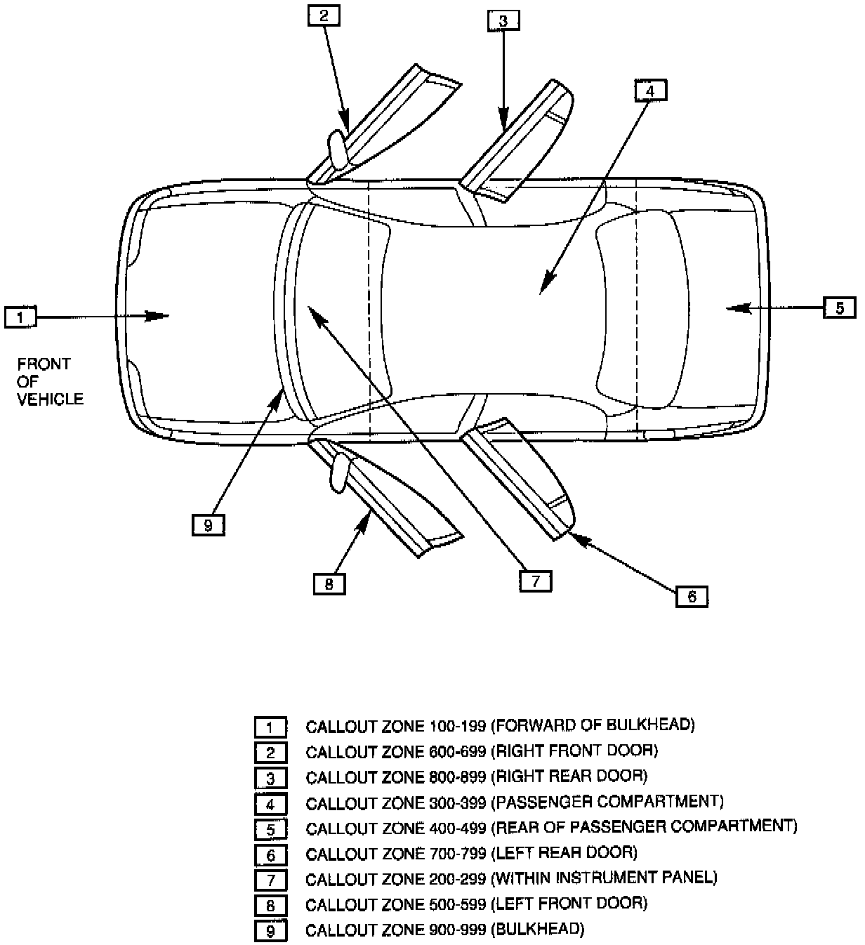 All connectors, grounds, and splices are labeled with numbers which correspond to specific areas of the vehicle. These numbers will help you locate connector, ground or splice in the vehicle. For example, connector C605 will be located somewhere in the right front door. For further information regarding these locations and labels, refer to the "Vehicle Zoning Callout Chart" (Figure 1).