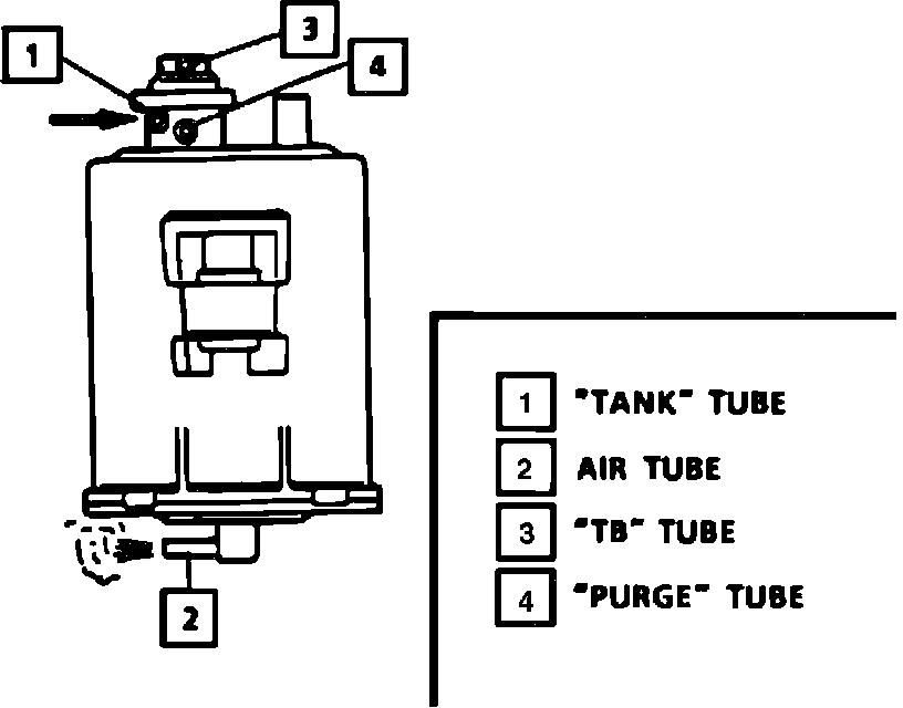 1. Using a small length of vacuum hose connected to the TANK tube, blow into the canister. Air should escape through the PURGE tube and AIR tube at the bottom of canister.