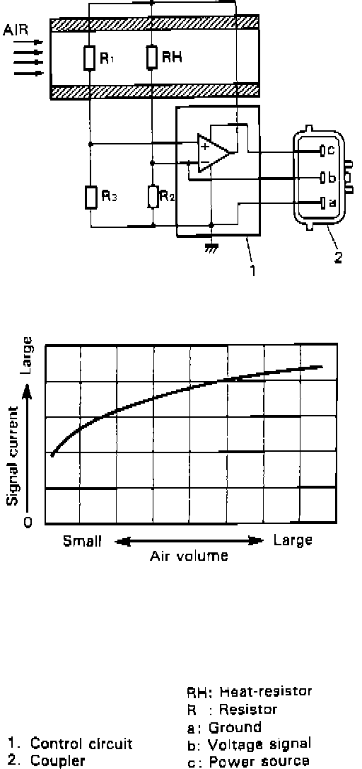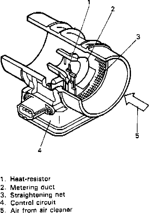 The MAF sensor consists of a heat resistor, metering duct, straightening net, body and control circuit. This MAF sensor is of the thermal control type. The heat resistor is cooled off by the air entering the MAF sensor. The control circuit controls the heat resistors temperature within a predetermined range of the ambient temperature. As the amount of air entering the sensor increases, then so does the sensors signal current to the ECM. As air flow decreases, then so does the signal current to the ECM.